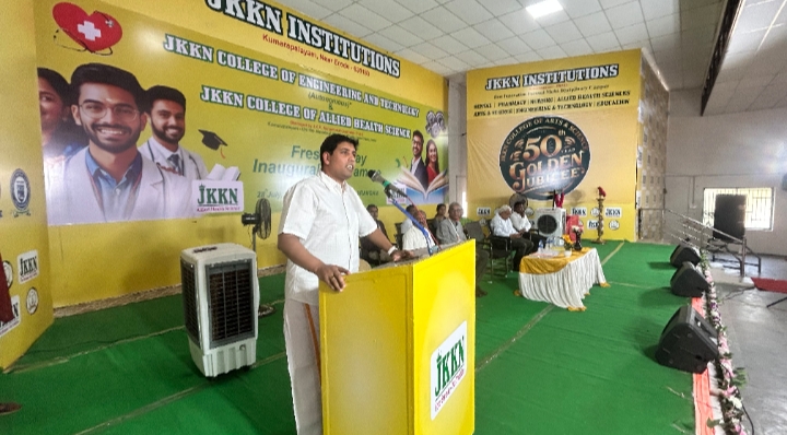 Dr. B. Dhanasekar, Principal of JKKN Dental College & Hospital (Allied Health Sciences), welcomed the freshers with insights into academic expectations, student responsibilities, and the various platforms available at JKKN to explore both academic and extracurricular growth.